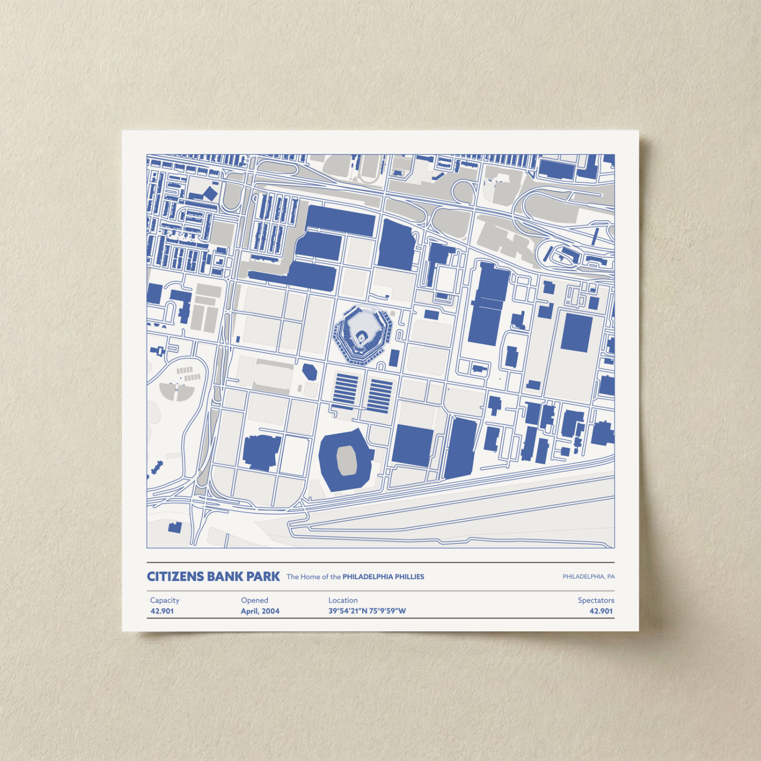 Our unframed Stadium Map prints are produced on thick, archival matte paper using premium pigment inks for sharp detail and long-lasting color. Each print arrives ready to be framed in any standard-size frame of your choice. The paper stock is the same museum-grade quality used in our flagship collections, ensuring a smooth finish and crisp stadium detailing.